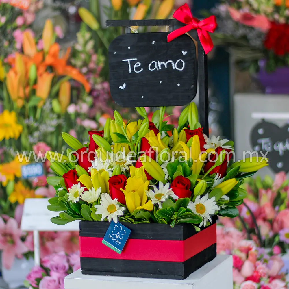 Bello floral compuesto con rosas, lirios y margaritas, elaborado en una bonita base de madera tipo pizarrón.
